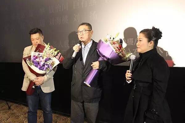 北京电影学院(湖南)培训中心宋红华副校长(前排左、身着黄衣)和电影导演侯克明(前排中)、主演高鹏(前排右)以及观众合影