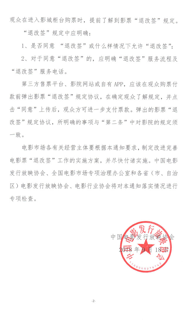 (1)全国各影院须在大堂醒目位置公示购票“退改签”须知,以保证观众提前了解相关“退改签”规定。