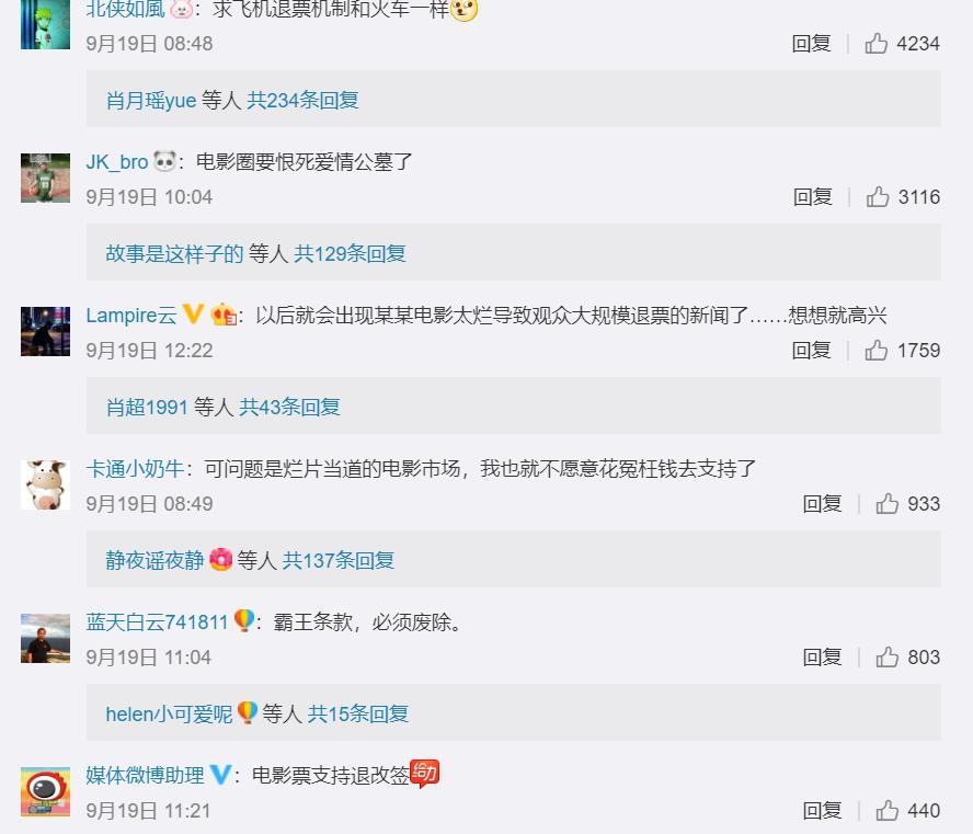 他表示:可参照火车票的“退改签”规定,电影票依据退票时间收取比例不等的退费手续费。同时,修订完善电影产业促进法,明确电影票“退改签”规定,防范误导消费者或实施不正当竞争。