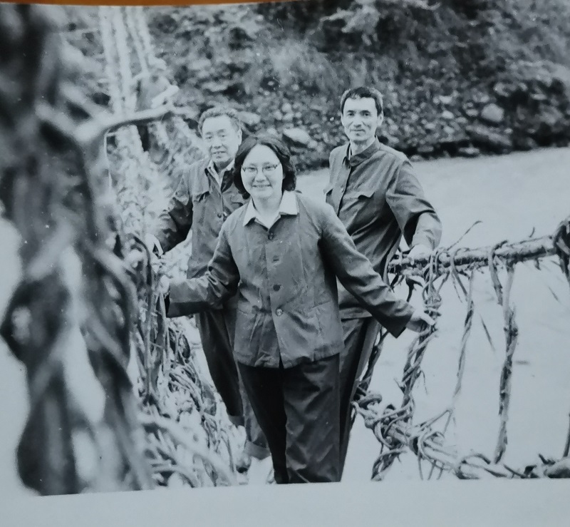 (1980年,江世雄拍摄故事片《舞恋》,在凉山甘洛采外景时,藤索桥留念